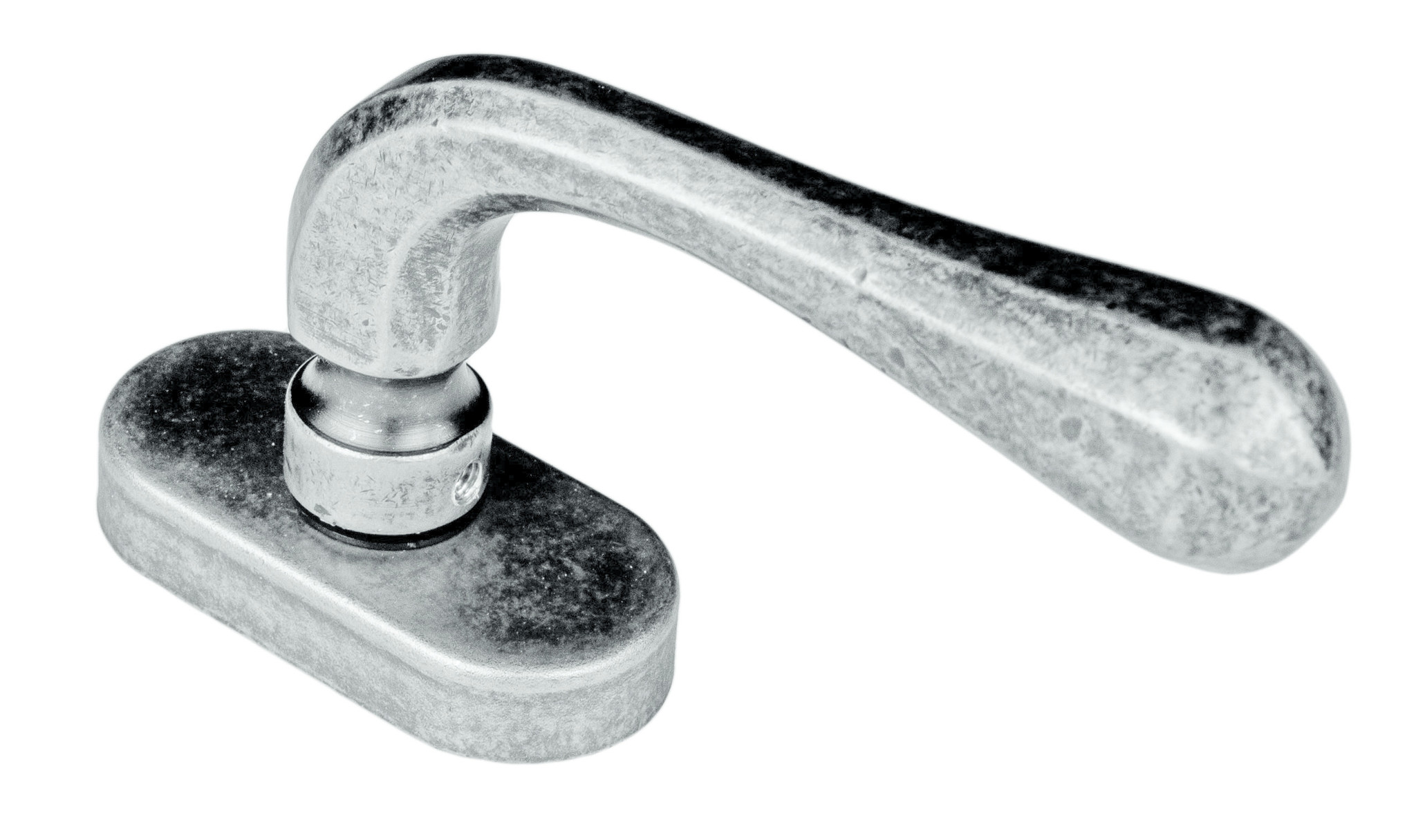 These old-silver L-shaped handles stand on an oval rosette of 64x30mm. The square spindle of 7x7x40mm. The distance between the mounting holes is 43mm.