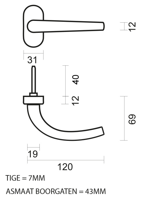 These window handles have a curved handle and oval rosette with a width of 31mm.
