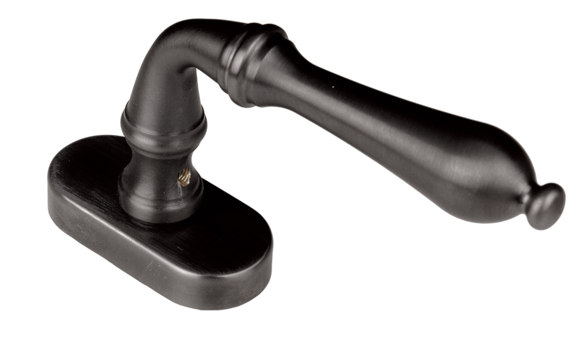 Classic window handle with Carbon finishing in turn-tilt version (DK stands for turn-tilt) with a curved L-shaped handle. The handle rests on an oval rosette of 65mm.