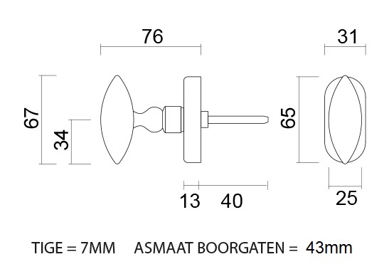 The old-silver oval-shaped handles with a maximum thickness of 25mm stand on an oval rosette of 65x31mm. The mounting holes are at a distance of 43mm.