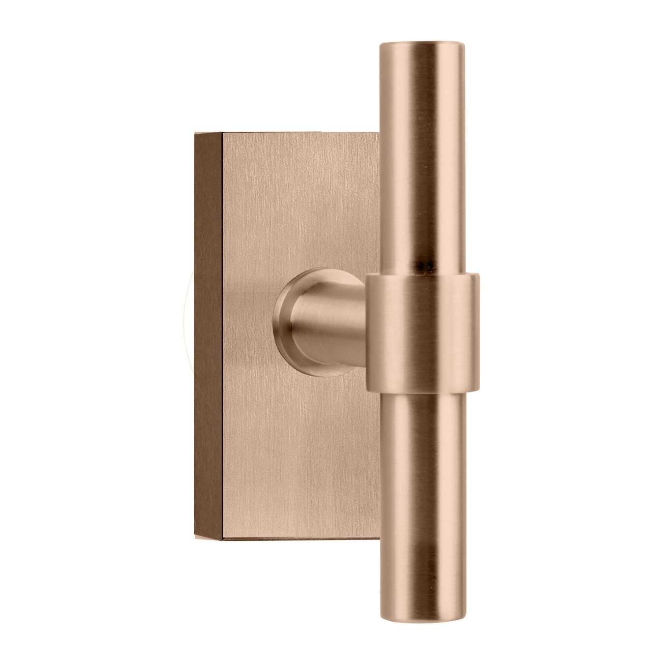 The bronze PVD window handle stands on a rectangular rosette of 70x35 mm that is 12 mm thick. The T-shaped handle has a length of 100 mm and a Ø of 15 mm. This window handle has a stainless steel base after which it is finished with a light bronze PVD coating.