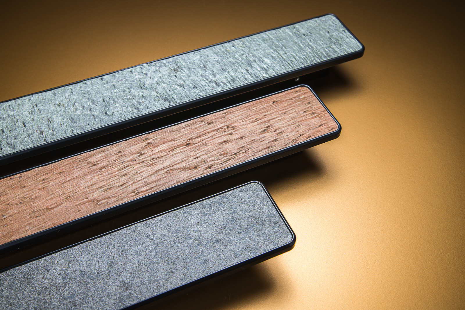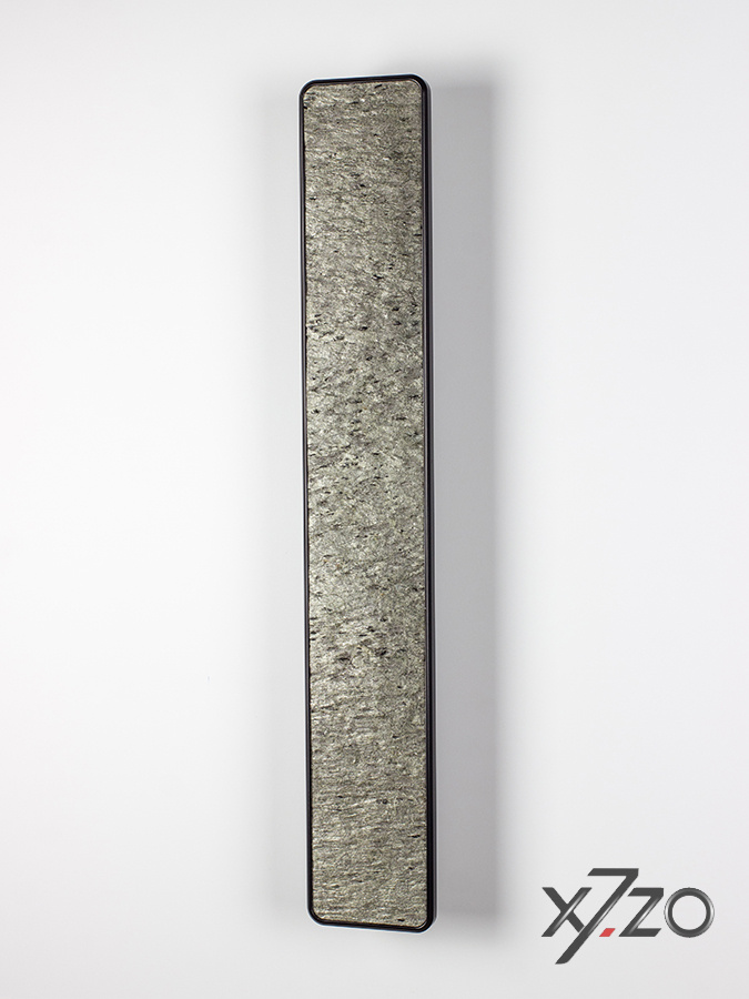 This beautiful rectangular door handle, designed and produced in Europe, combines a sturdy aluminum base with a refined stone veneer finish in a warm glossy silver color.
