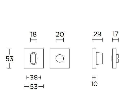The rosettes of this toilet set are 53x53 mm and 10 mm thick.