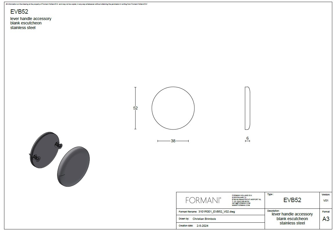 Cette plaque aveugle en acier inoxydable massif EVB52, conçue par Edward Van Vliet, est fournie individuellement avec le matériel de montage.