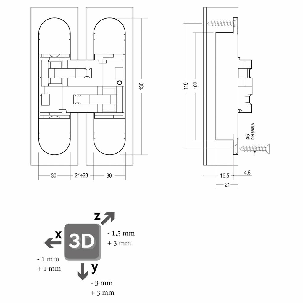 | Faites de votre porte une partie de l'intérieur avec les charnières de porte invisibles d'Intersteel. Cette charnière cachée est entièrement intégrée dans la porte, la rendant invisible lorsque la porte est fermée. Cela crée un look élégant dans votre intérieur. Cette charnière a un boîtier en fibre de verre et est donc légère. L'intérieur est en alliage de zinc puis galvanisé et les plaques de recouvrement en acier sont nickelées. La charnière a une taille de 130 x 30 mm et convient aux portes avec une épaisseur de porte minimale de 35 à 45 mm. Avec ces dimensions, elles sont bien plus grandes que les charnières Eclipse. Ils ont également une plus grande capacité de charge. Ils sont de haute qualité et ont été testés pour un usage intensif : 200 000 mouvements d'ouverture et de fermeture. Ces charnières 3D sont fournies par pièce. Garantie et entretien Cette charnière est autolubrifiante, ce qui signifie que vous n'avez aucun entretien sur cette charnière. Conseils de montage Cette charnière est réglable en 3D. Cela signifie que vous pouvez régler la charnière verticalement, horizontalement et en profondeur. Cela garantit une installation précise et vous pouvez facilement les ajuster lorsque vous accrochez la porte. Pour les portes d'une hauteur de 2115 mm, nous recommandons d'utiliser trois charnières et les portes d'une hauteur de 2315 mm pour utiliser quatre charnières. Pour les portes pesant jusqu'à 80 kg, nous recommandons deux charnières et trois charnières jusqu'à un poids de 120 kg.