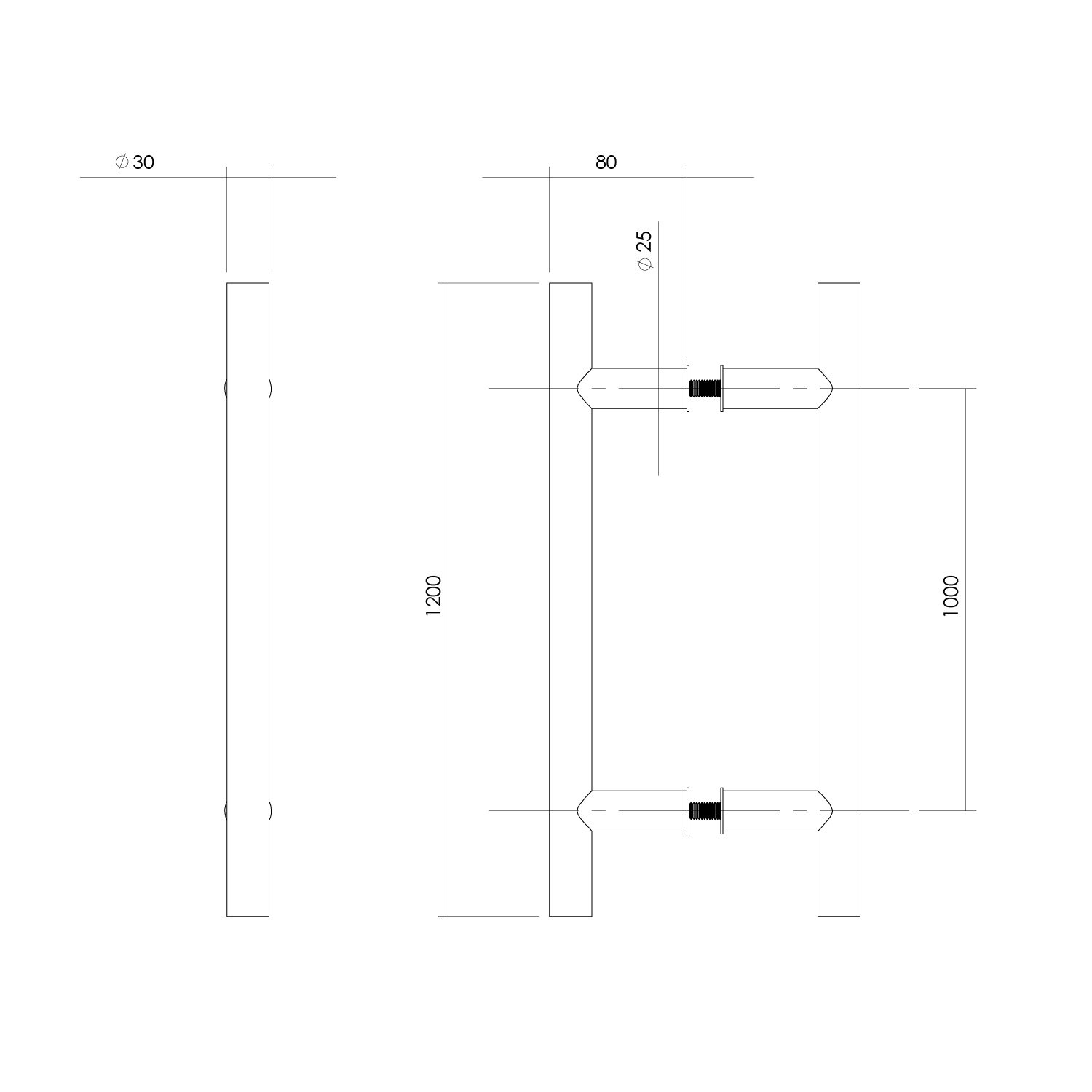 Les poignées de porte en acier inoxydable ont une longueur de 1200 mm, une épaisseur de 30 mm et une avancée de 80 mm. L'entraxe est de 1000 mm. L'épaisseur de 30 mm vous assure une belle prise en main épaisse.