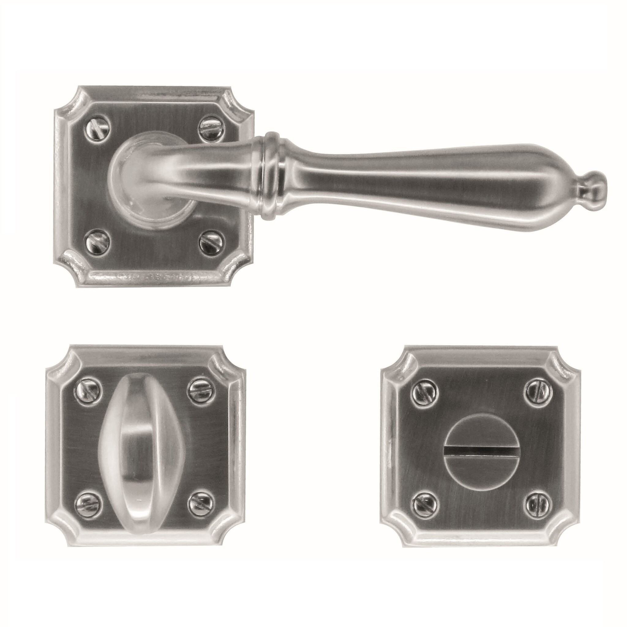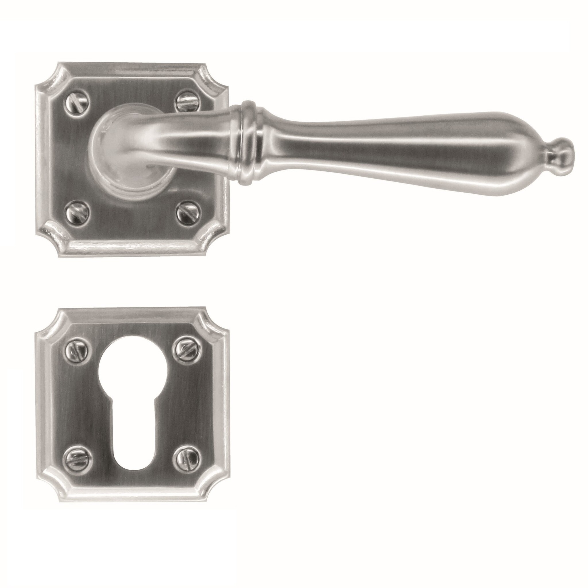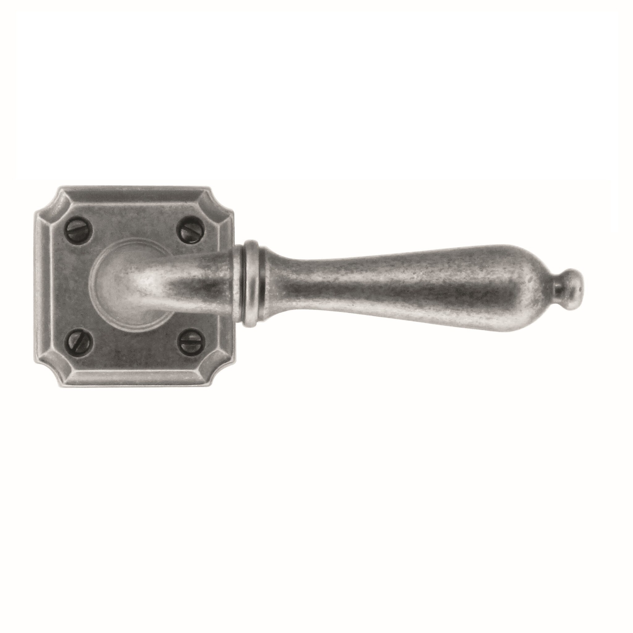 Poignées de porte anciennes en argent Lisa sur rosace carrée disponible en 4 variantes
