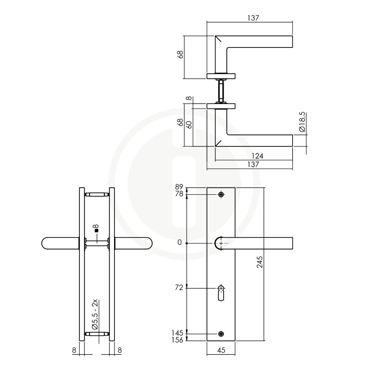 Le bouclier sur lequel se trouvent ces poignées de porte mesure 245x45 mm et s'étend sur 8 mm.