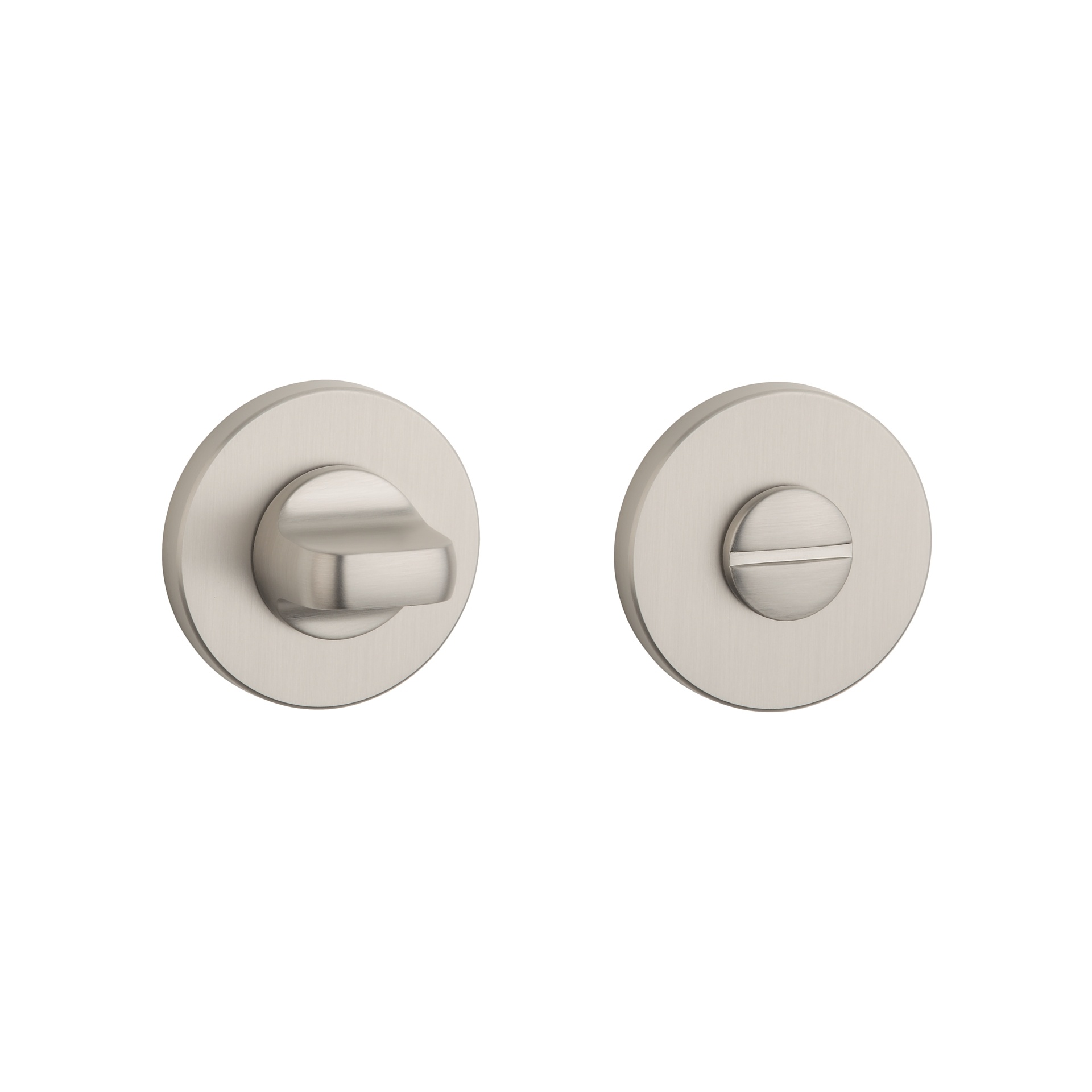 Cette robinetterie WC en nickel mat est dotée de rosaces rondes de Ø 52 mm de seulement 7 mm d'épaisseur pour un rendu esthétique sur les portes.