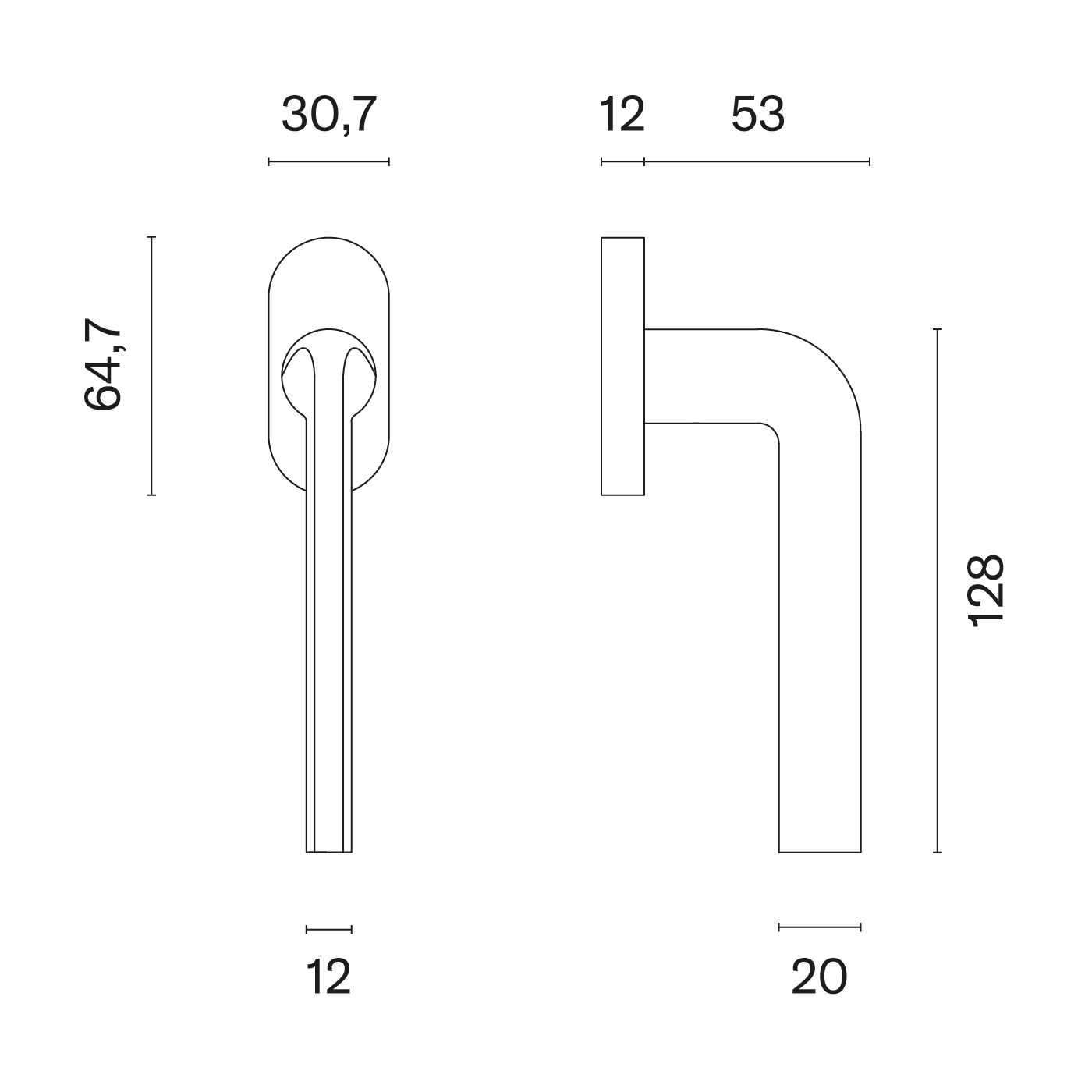 Le manche, qui mesure 20x12 mm, repose sur une rosace ovale de 64,7x30,7 mm.