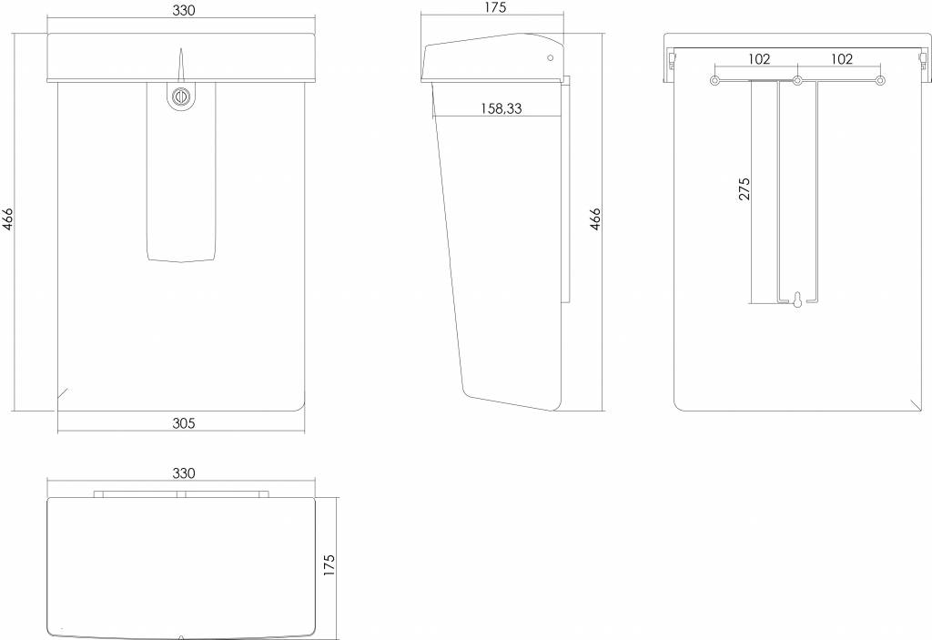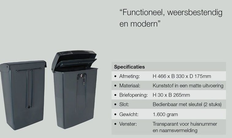 La boîte aux lettres est munie d'un couvercle, en dessous se trouve une ouverture d'insertion avec une cloison refermable. La taille de la fente est de 3 cm x 27 cm.