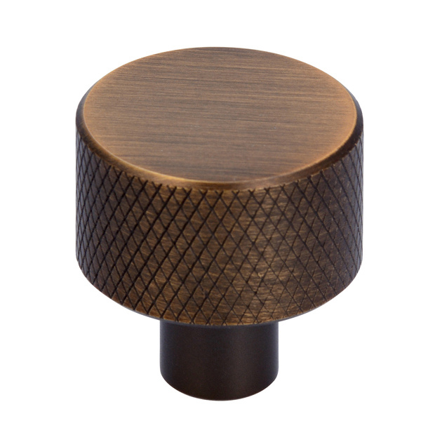 Beau bouton de meuble rond en aluminium avec un revêtement en laiton antique solide. Le bouton est brossé, ce qui crée et préserve l'aspect antique. Le motif à nervures croisées est frappant sur ce bouton de meuble.