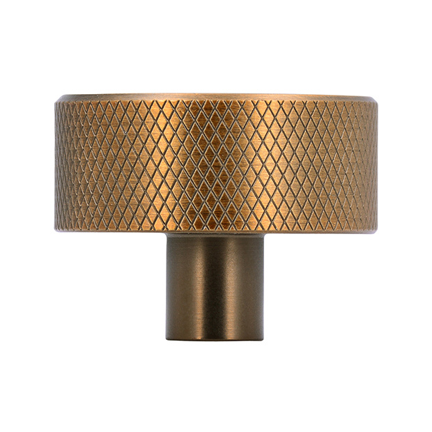Beau bouton de meuble rond en aluminium avec un revêtement en laiton antique solide. Le bouton est brossé, ce qui crée et préserve l'aspect antique. Le motif à nervures croisées est frappant sur ce bouton de meuble.