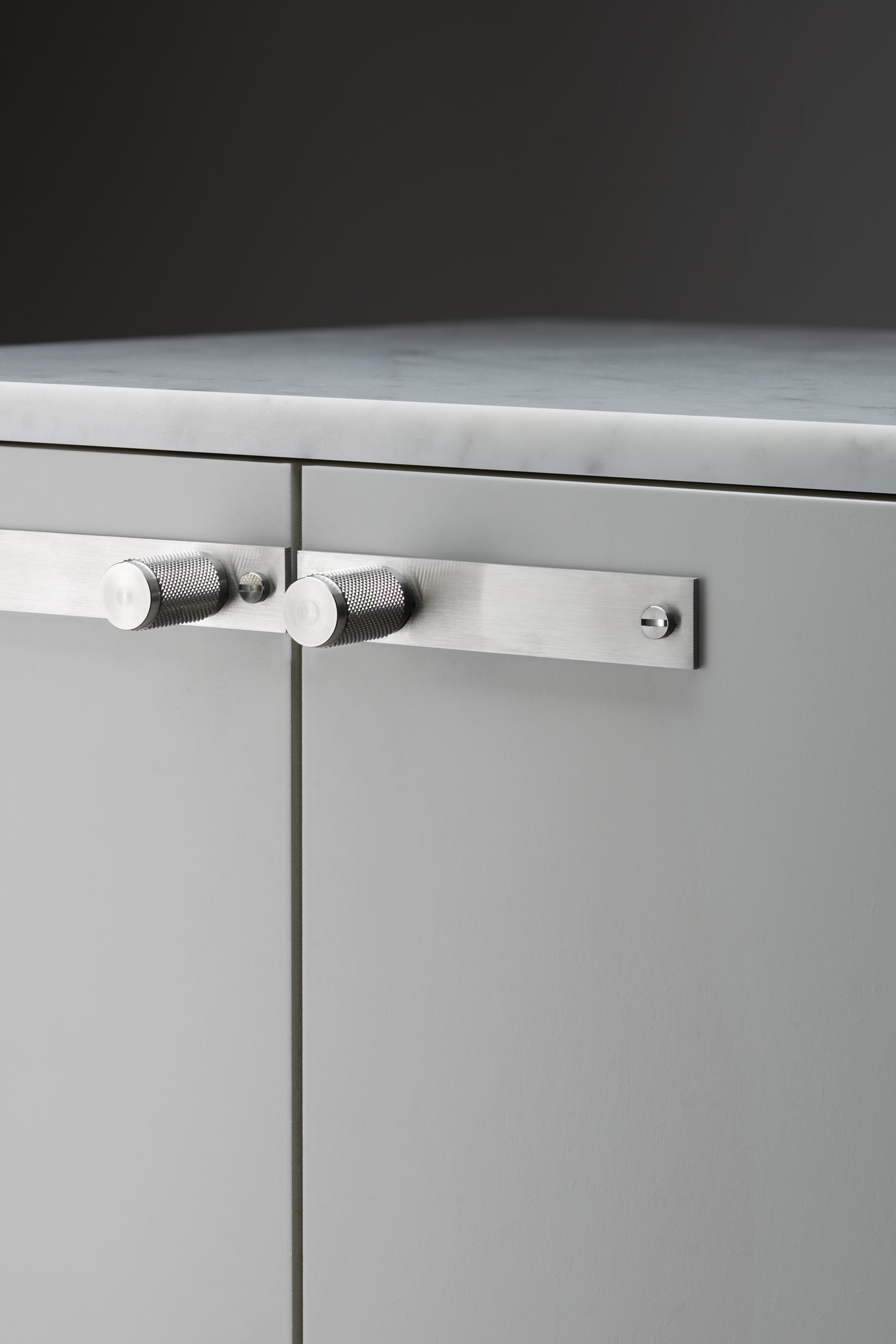 Paire de boutons de meuble Buster + Punch sur plaques solides en acier inoxydable