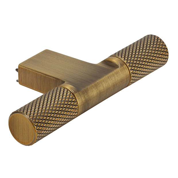 Bouton de meuble en forme de T de 72 mm avec un motif côtelé entrecroisé et un aspect laiton antique