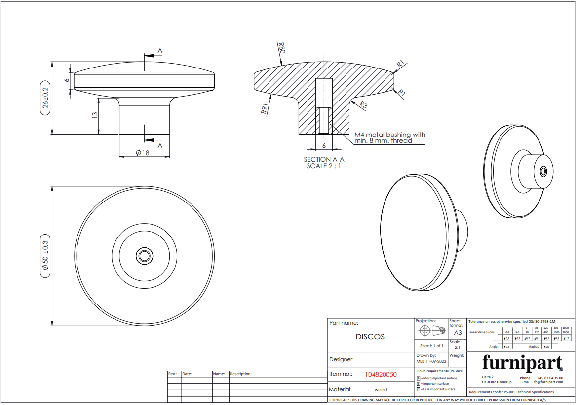 L'élégant bouton de meuble rappelle le disque classique, un chef-d'œuvre géométrique. La lumière joue avec l'arc géométrique et fait apparaître les grains du bois. La forme circulaire est soulignée par une arête vive qui confère au design caractère et impact visuel.