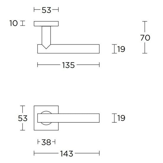 Les rosaces mesurent 53 x 53 mm et ont une épaisseur de 10 mm. La longueur des poignées est de 135 mm. Vous trouverez d'autres dimensions sur le dessin technique.