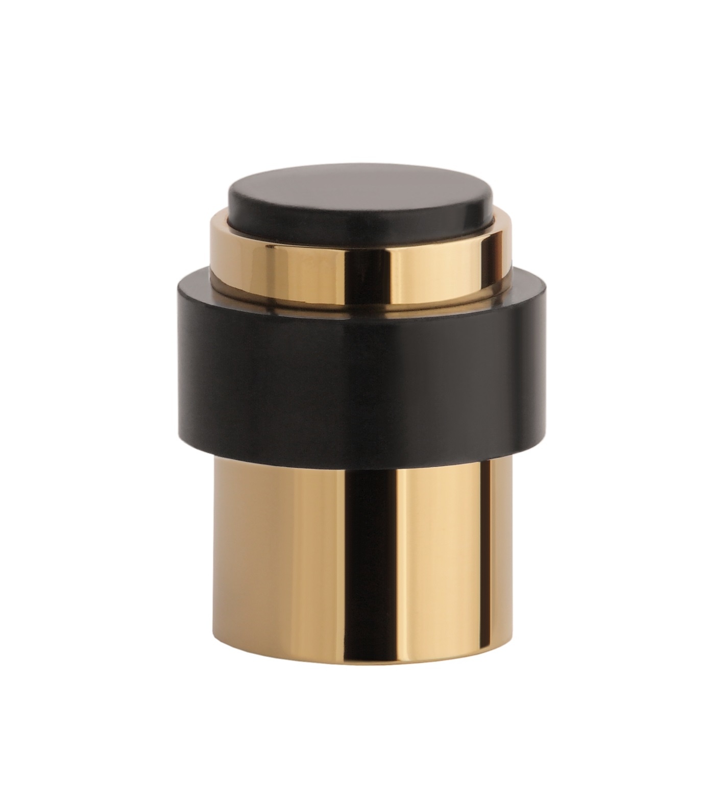 Ce butoir de porte design massif est équipé d'un anneau en caoutchouc au milieu et également fini avec un anneau supérieur en caoutchouc. Cela permet à ce butoir de porte en PVD doré d'être monté aussi bien au sol qu'au mur.