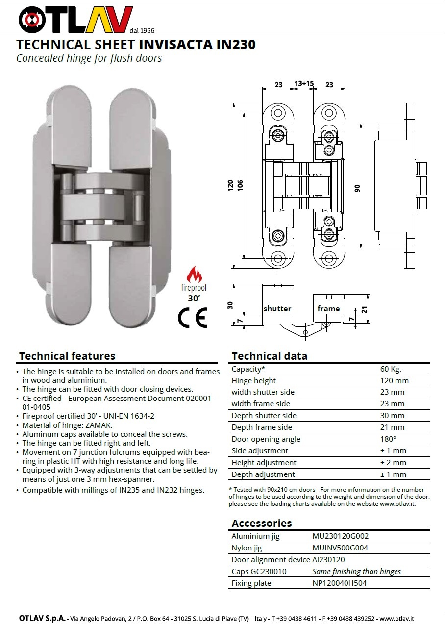 Ces charnières invisibles argentées Otlav Invisacta IN230120 supportent une charge de 60 kg avec deux charnières. Elles sont également résistantes au feu pendant 30 minutes.