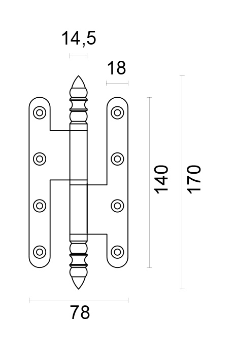 L'épaisseur de la charnière est de 3,5 mm. La hauteur des ailes est de 140 mm et la largeur totale de la charnière ouverte est de 80 mm.