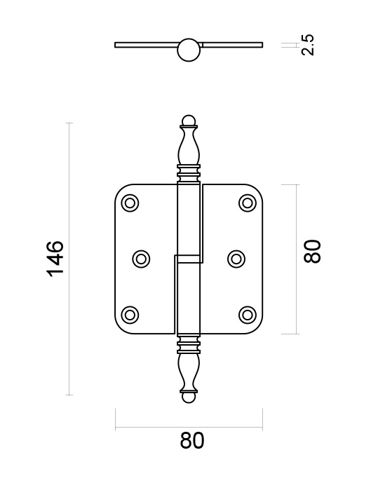 Ces vieilles charnières jaunes classiques ont les dimensions suivantes : 80x80x2,5mm. Le modèle 'vase' se caractérise par le petit décor au-dessus et en dessous de l'axe de la charnière. Ces charnières peuvent être joliment combinées avec nos poignées de porte d'aspect bronze.