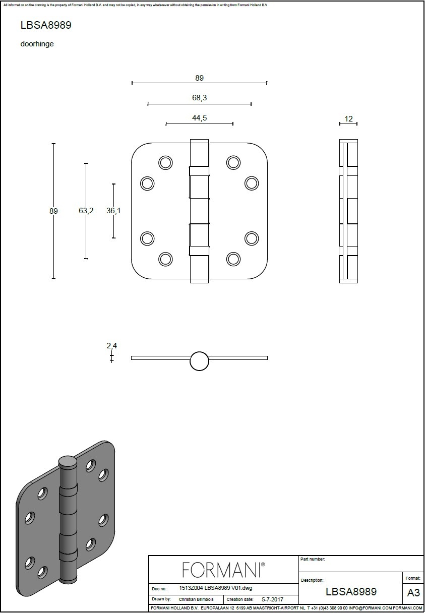 Ces charnières sphériques en or mat 'Basics LBSA8989' de Formani ont des coins arrondis et ont les dimensions suivantes : 89x89x2,4 mm.