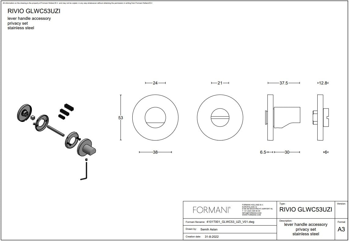 L'ensemble WC en acier inoxydable est doté d'une finition PVD bronze clair et résistante. Les plaques ont un diamètre de 53 mm et une épaisseur de seulement 6,5 mm.