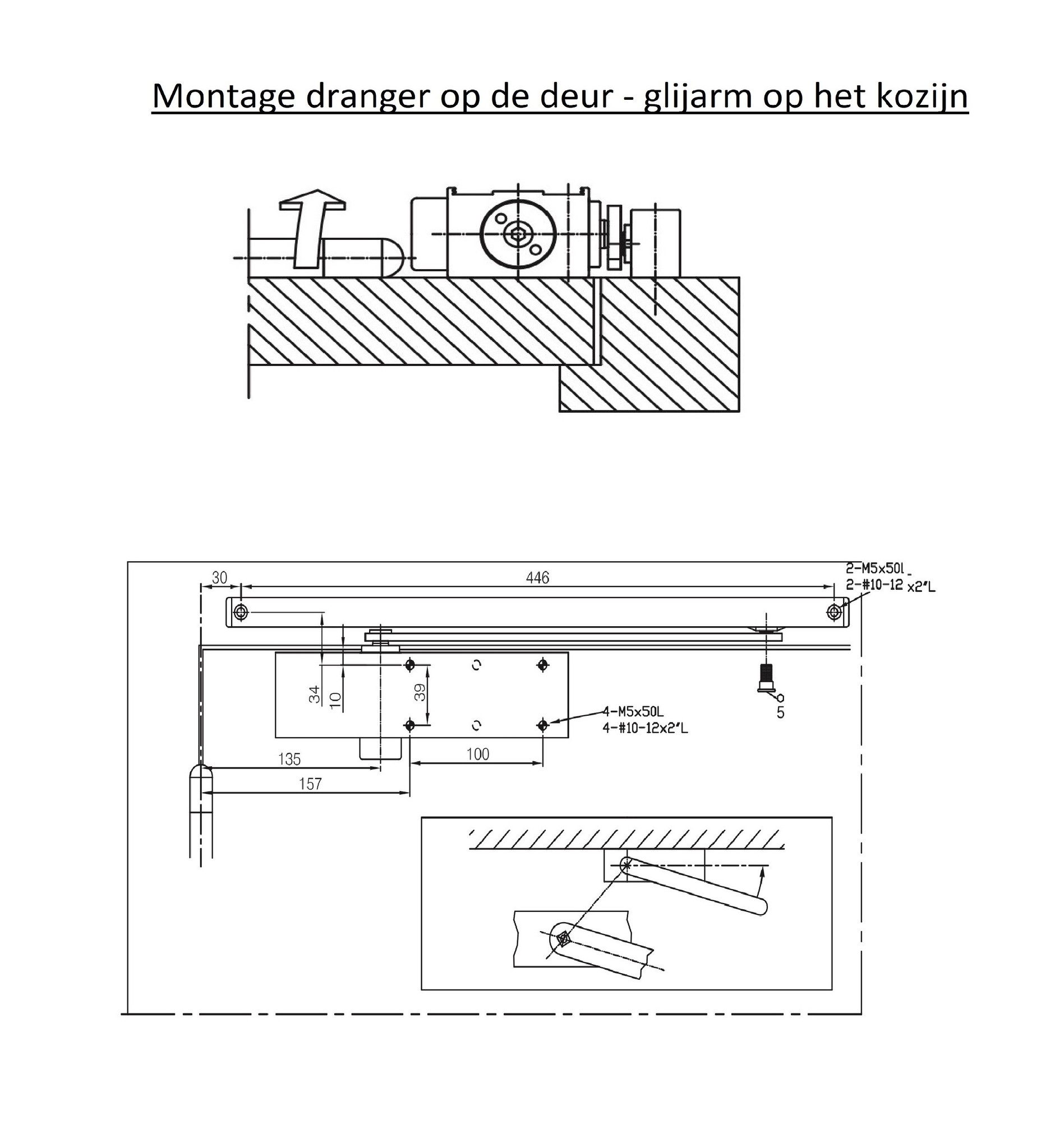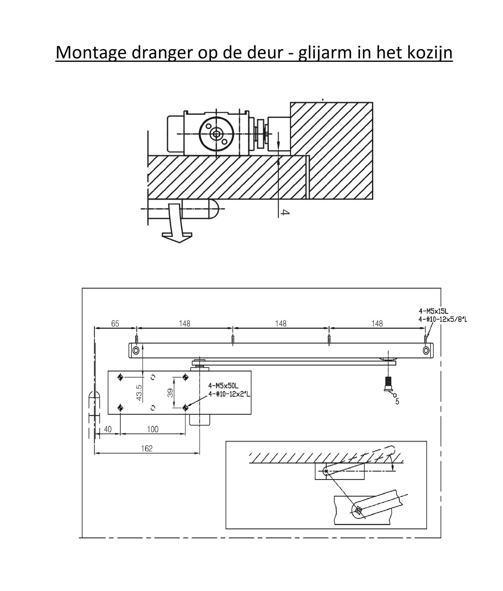 Ce ferme-porte peut être monté de trois manières différentes, à savoir avec le ferme-porte sur la porte et le bras sur le cadre, avec le ferme-porte sur le cadre et le bras sur la porte, et avec le support de porte sur la porte et le bras dans le cadre de la fenêtre. Voir les images ci-jointes pour les trois options.