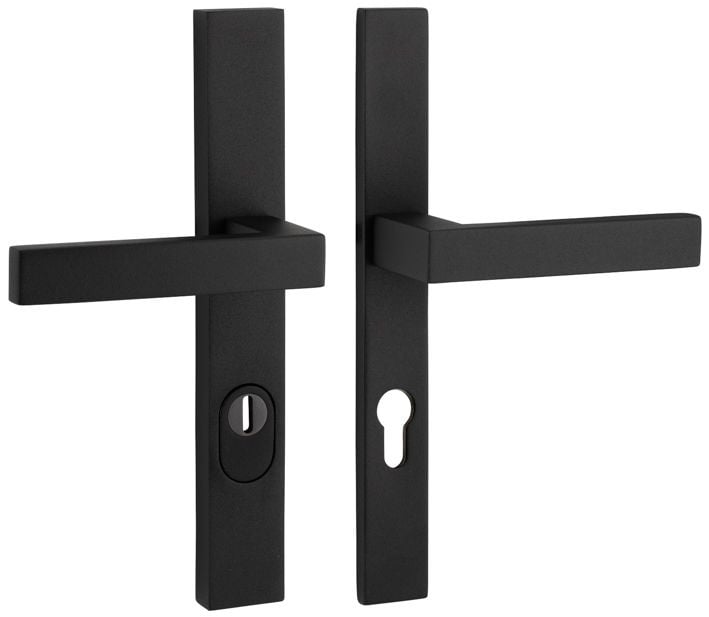Description Un ensemble de ferrures de porte avant sur une plaque avec protection anti-arrachement et deux poignées de porte METRO noires à texture fine. L'entraxe est de 72 ou 92 mm.