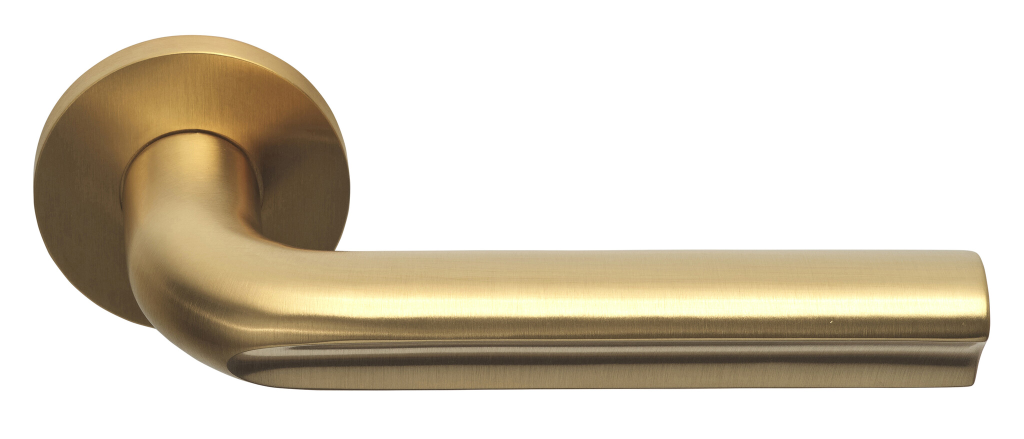 Description Poignées de porte à ressort massif ECLIPSE sur une rosace ronde en or mat de Formani avec un beau coin incurvé