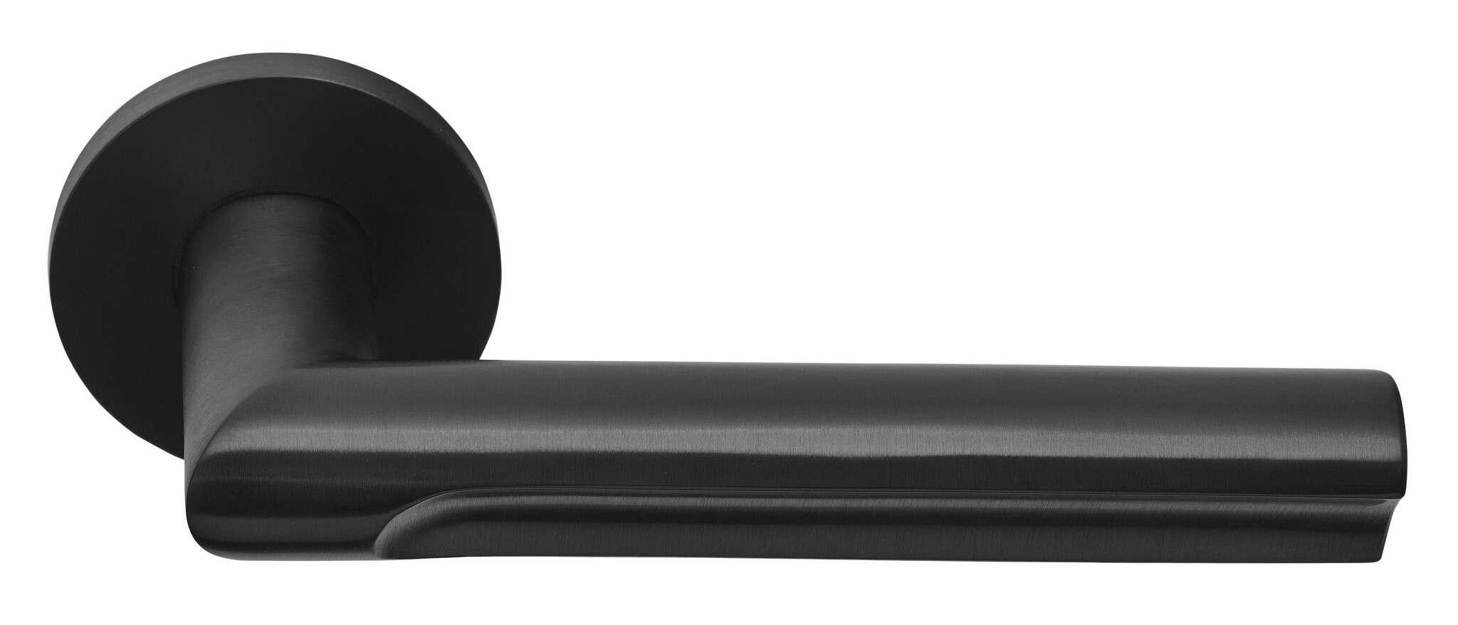 L'évidement en forme d'éclipse, propre à cette collection, court agréablement sur cette poignée de porte jusqu'à l'angle droit de cette poignée de porte.