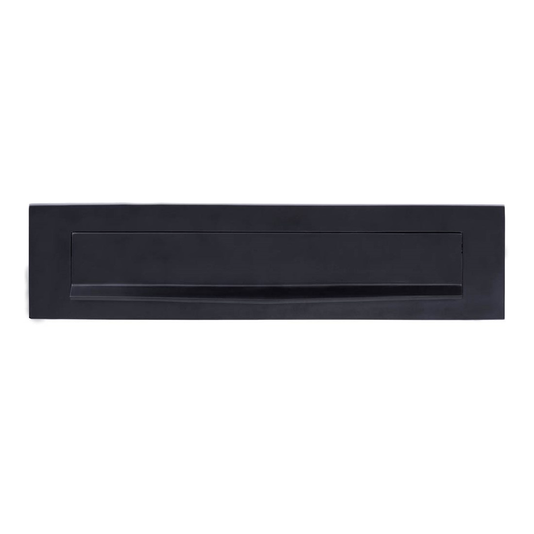 Plaque de porte d'entrée solide en acier inoxydable recouverte d'un revêtement en poudre noire. La plaque de porte avant est équipée d'un rabat sans ressort qui pivote vers l'extérieur.