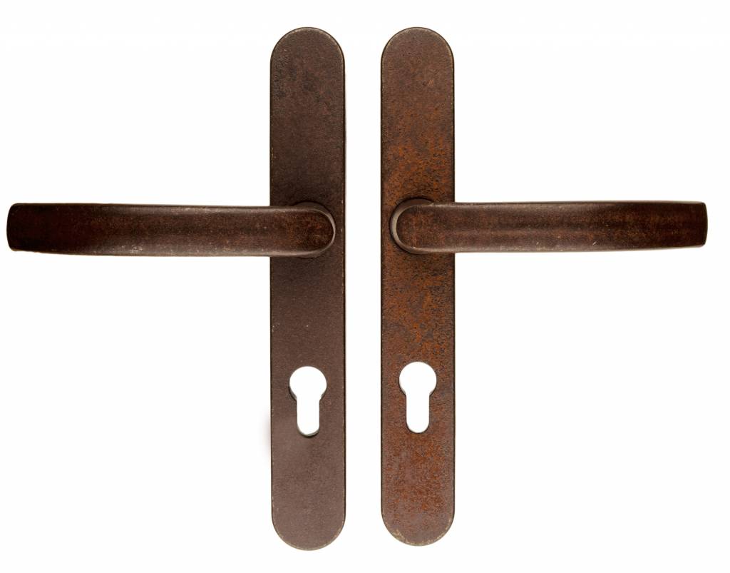 Ferrure de sécurité couleur rouille en version poignée + poignée avec serrure taille 72 ou 92 mm