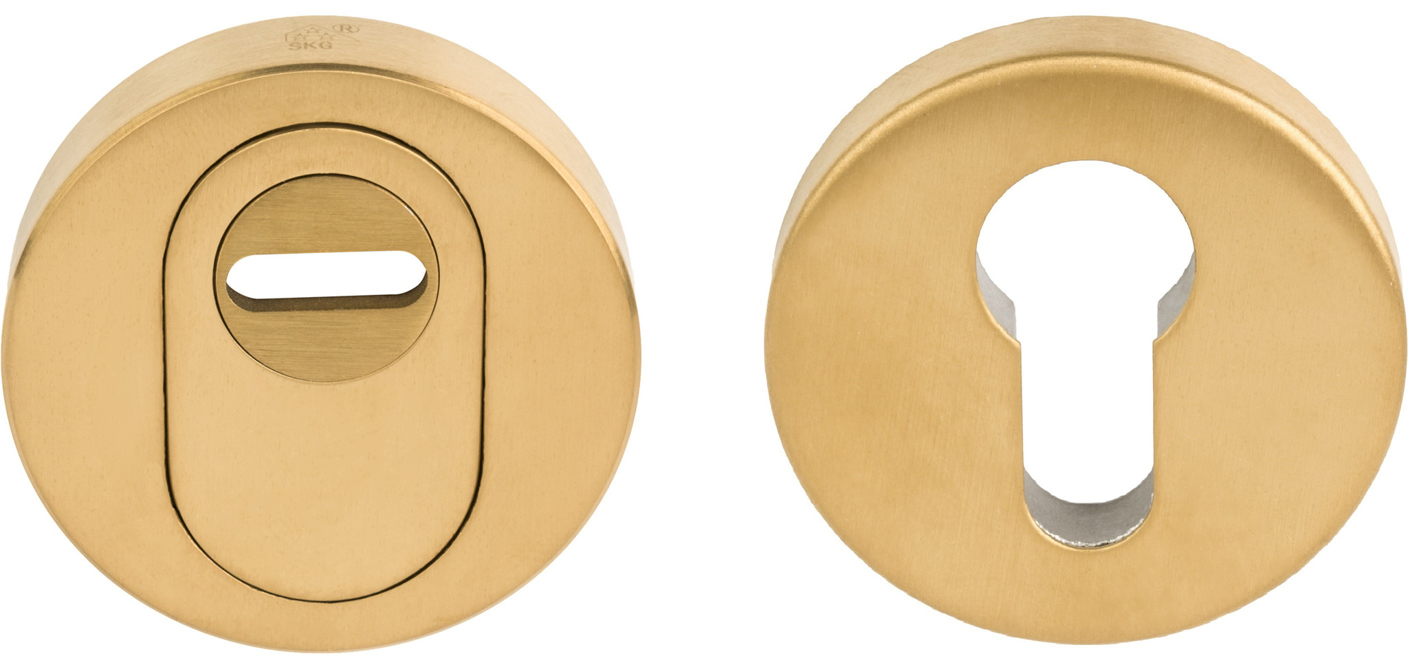 Rosace de cylindre de sécurité solide Basics BVEIL-KT SKG*** avec une finition PVD or mat. Cet ensemble avec protection anti-arrachement est certifié par le label de qualité de la police « Safe Living ».