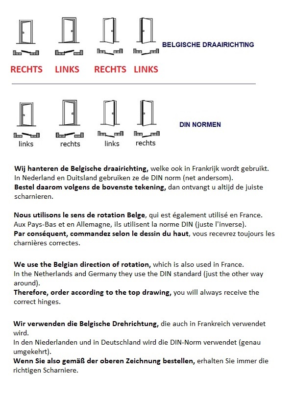 REMARQUE : La Belgique utilise un sens de rotation différent de la norme DIN. Par conséquent, veuillez commander uniquement en vous référant au schéma ci-joint. Ainsi, vous recevrez toujours les charnières appropriées.