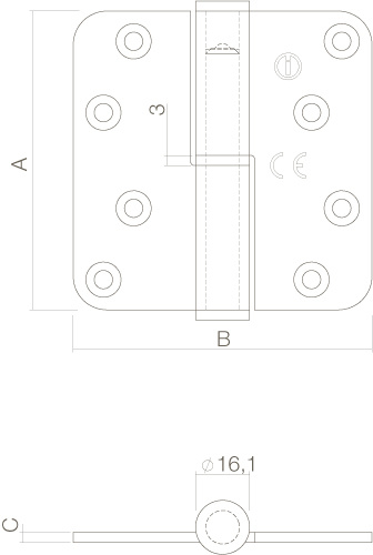 Cette charnière mesure 89 mm de haut et 89 mm de large une fois dépliée, et ses lames ont une épaisseur de 3 mm. Elle convient aux portes pesant jusqu'à 90 kg.