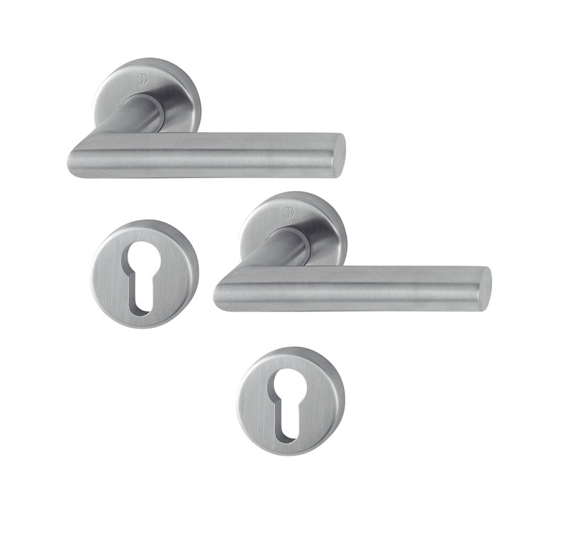 Ces poignées de porte en acier inoxydable de Hoppe sont équipées de plaques cylindriques et d'une goupille rapide.