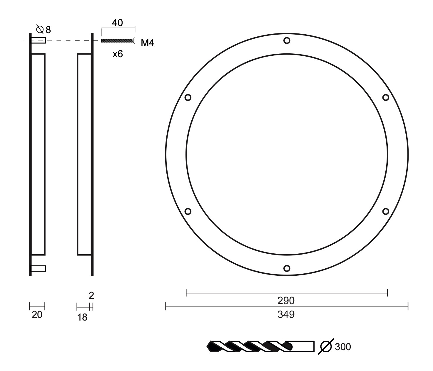 - Hublot rond 290 mm noir avec trous de vis : ceux-ci se fixent des deux côtés à l'aide de vis (fixation visible des deux côtés)