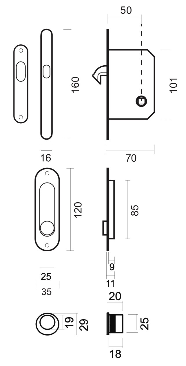 La serrure à crochet noire a une plaque frontale de 160x 16mm et est fournie avec une plaque frontale noire. Il y a aussi un bout de doigt noir que vous pouvez fraiser à l'extrémité de la porte coulissante. De cette façon, vous pouvez toujours fermer la porte, même si elle est complètement dans le mur et que vous ne pouvez pas atteindre les portes coulissantes.