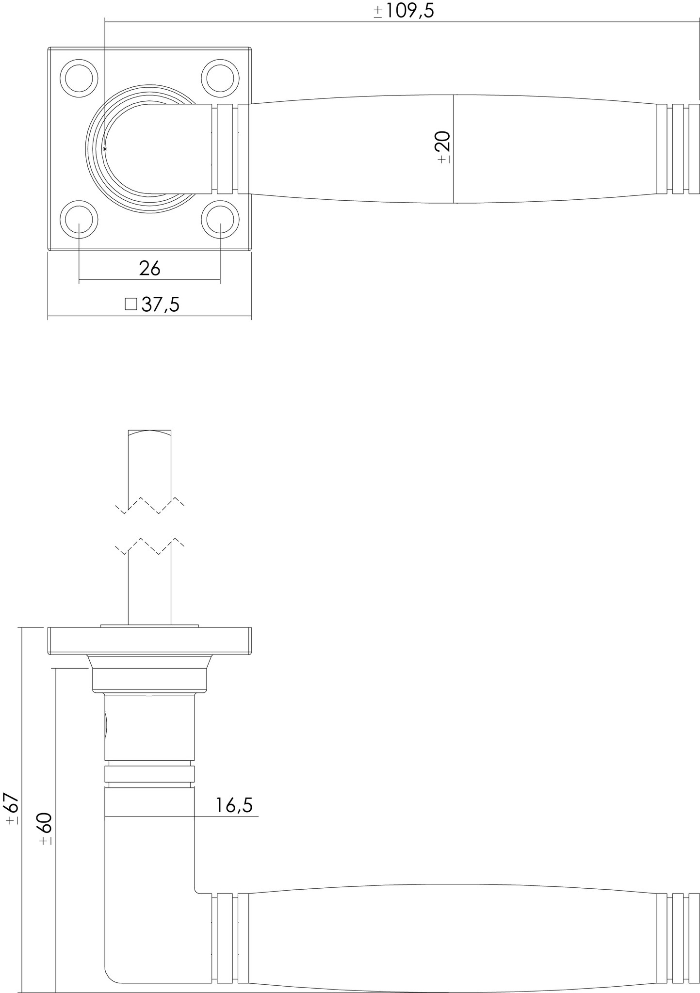 Ces poignées de porte se tiennent sur de petites rosaces carrées (38x38x7mm) avec des trous de vis et sont fournies par paires avec broche carrée (8x8mm) et matériel de montage.