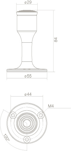 Cette butée de porte s'avance de 85 mm et possède un anneau de fixation d'un Ø de 56 mm. 3 trous de fixation sont déjà prévus dans cette bague.