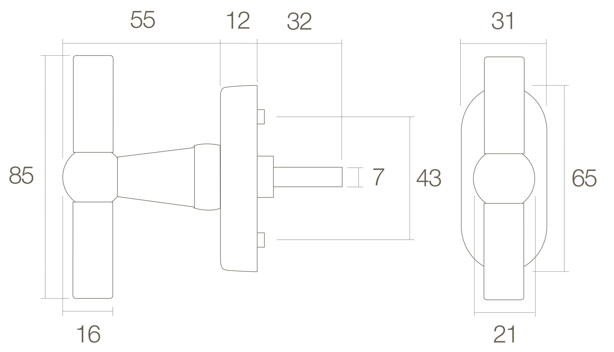 Cette poignée en forme de T d'une épaisseur de 16mm repose sur une rosace ovale de 65x43mm qui dépasse de 12mm. Les trous de montage sont espacés de 43 mm.