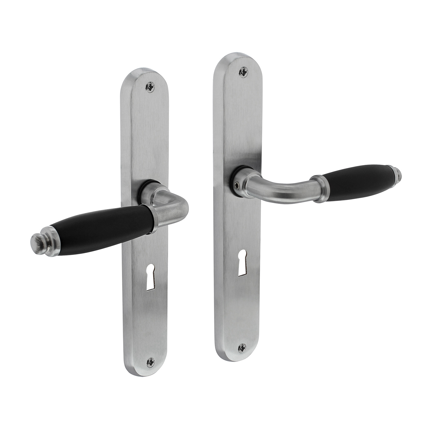 Ces poignées de porte sont disponibles en 4 variantes : sans trou de serrure, avec trou de serrure 56-72 mm, avec trou de cylindre 72 mm ou avec garniture WC 63-78 mm. Faites votre choix dans le menu déroulant en haut à droite .