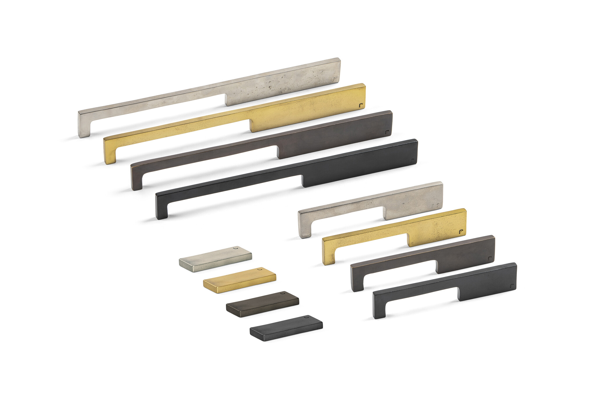 Description Poignées de meubles moulées au sable A-SYMM avec base large et base étroite, conçues par JOLIE design en bronze vieilli