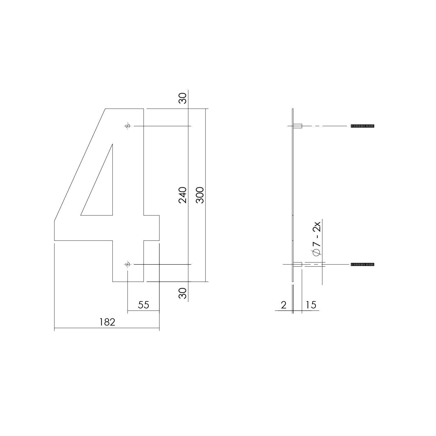 Il a une hauteur de 300 mm et une épaisseur de 2 mm. Une fois monté, le numéro de maison est à 15 mm du mur.