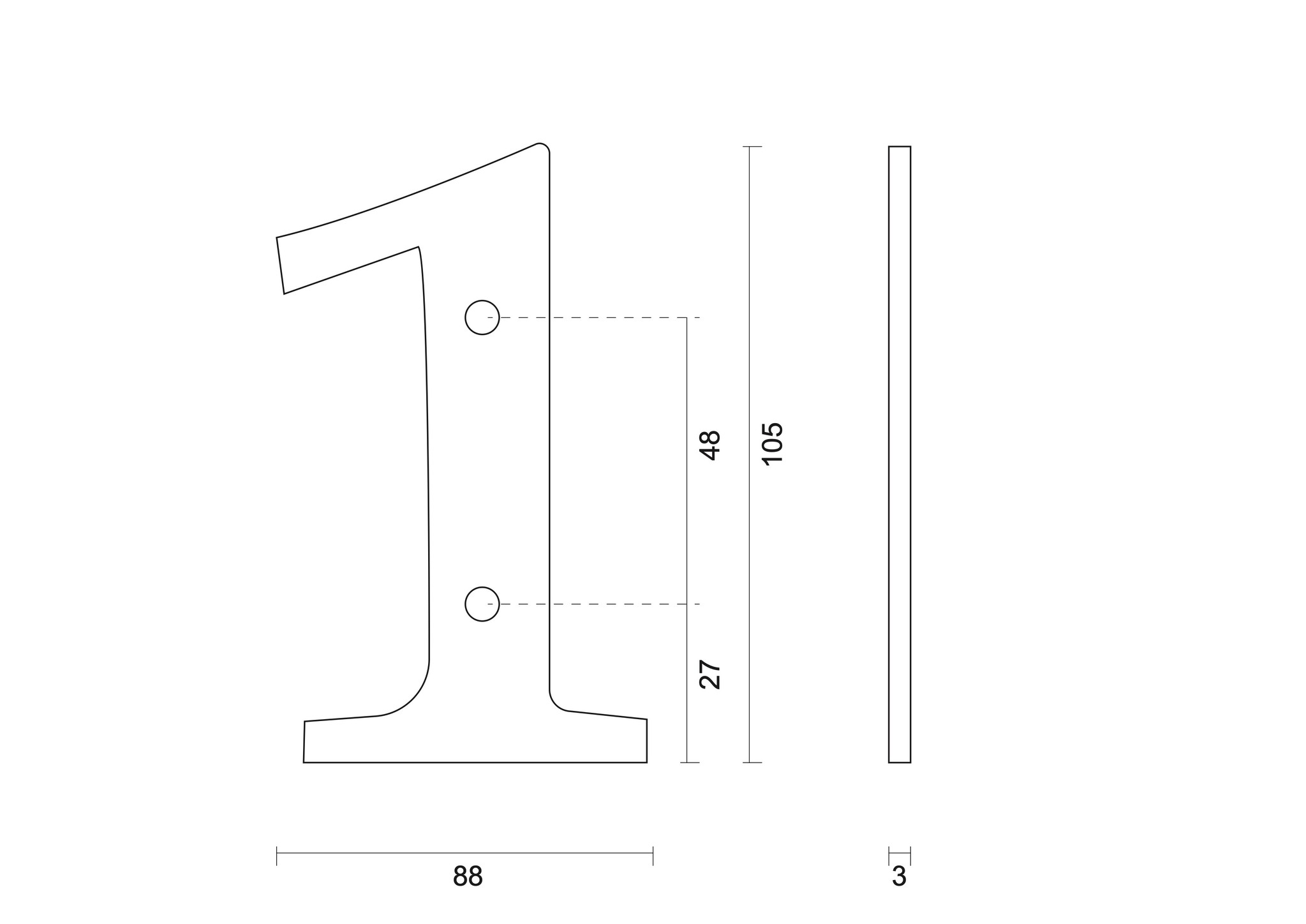 Ce numéro de maison noir "1" convient au montage mural, a une hauteur de 105 mm et une épaisseur de 3 mm.