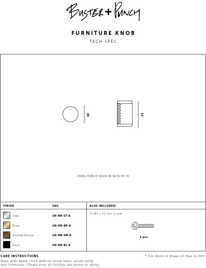 Astuce : combinez ces boutons de meubles avec les autres produits Buster&Punch sympas tels que les poignées de porte, les poignées d'armoire, les interrupteurs électriques et les interrupteurs d'éclairage. Tous présentent le magnifique motif en forme de croix taillé en diamant.