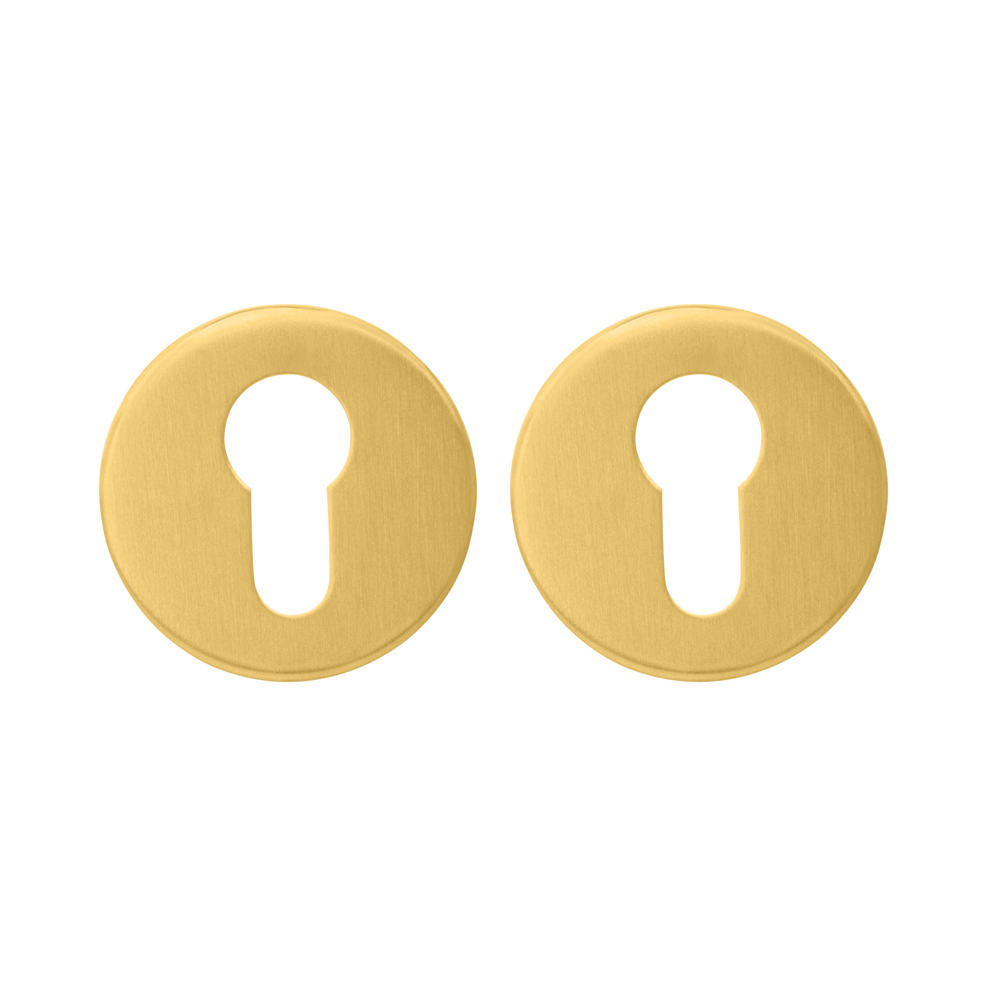Ces plaques cylindriques dorées ont un Ø de 53 mm et appartiennent aux poignées de porte Supra.
