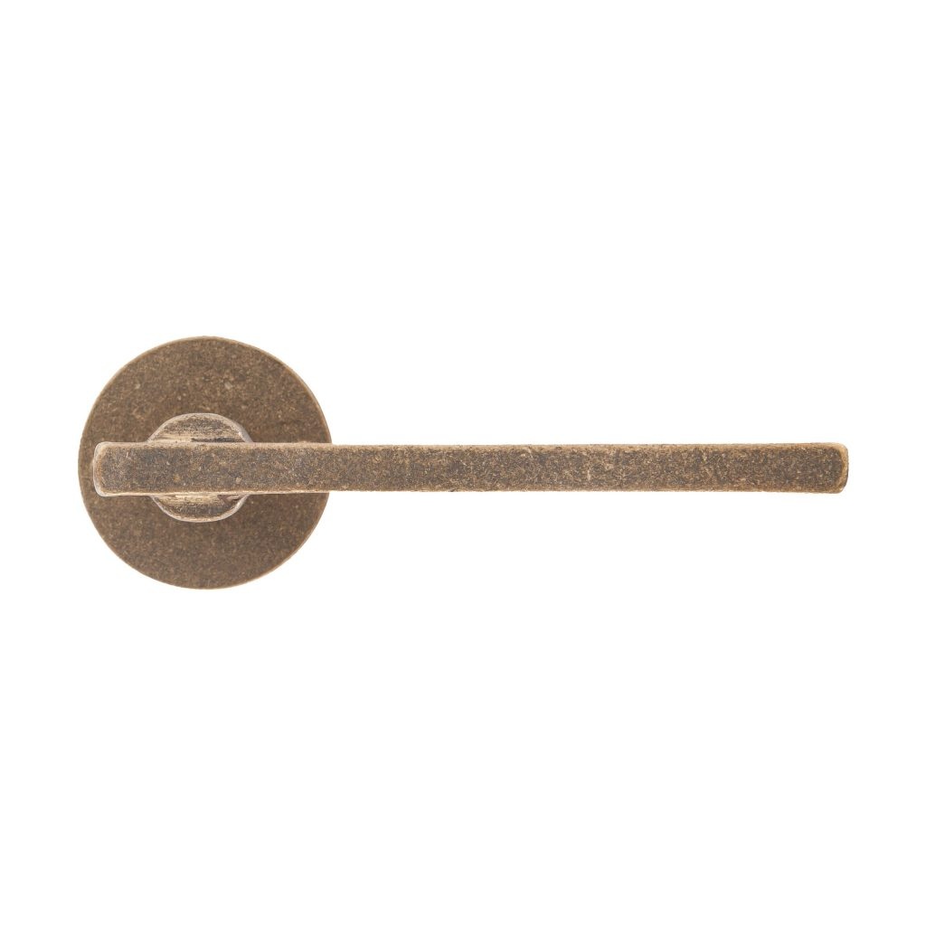 Les poignées de porte en bronze brut sont montées sur une rosace ronde de 50mm dont les points de fixation sont espacés de 38mm.