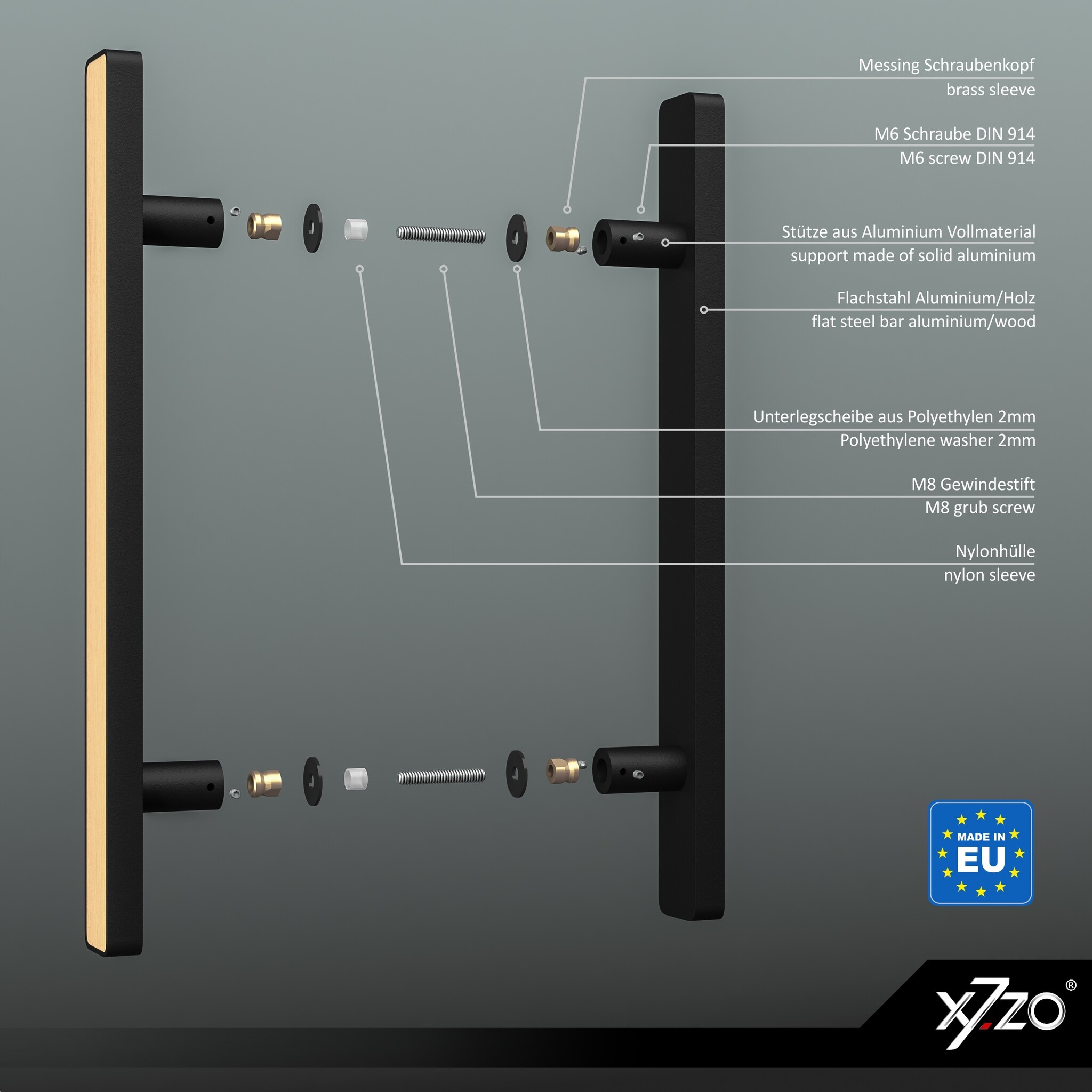 Le bois de chêne est pourvu d'une huile protectrice jusqu'à 3 fois, ce qui assure une longue durée de vie du bois. Les supports sont en aluminium et sont finis avec un revêtement noir anodisé.